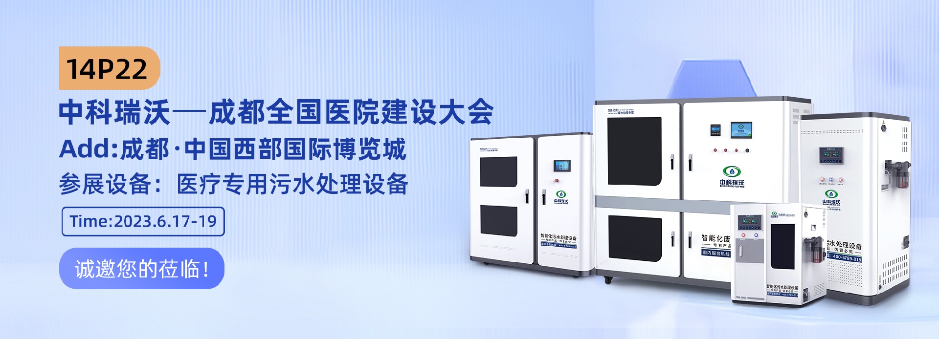 歡迎大家蒞臨中科瑞沃14P22,屆時我們會有專業的技術和業務人員,為您提供專業及時的解答和指導,不論您是針對設備的使用,或者對于污水危害的關注,再或者是對于醫療污水處理的疑問,您都可以找到我們,我們一定會提供專業領域靠譜的解答,熱情禮貌的招待,互利共贏的合作。