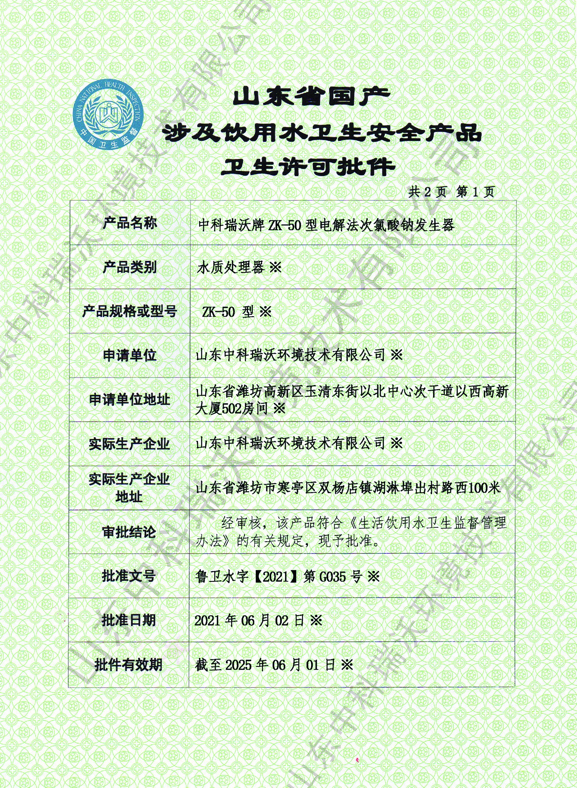 電解次氯酸鈉衛(wèi)生許可批件